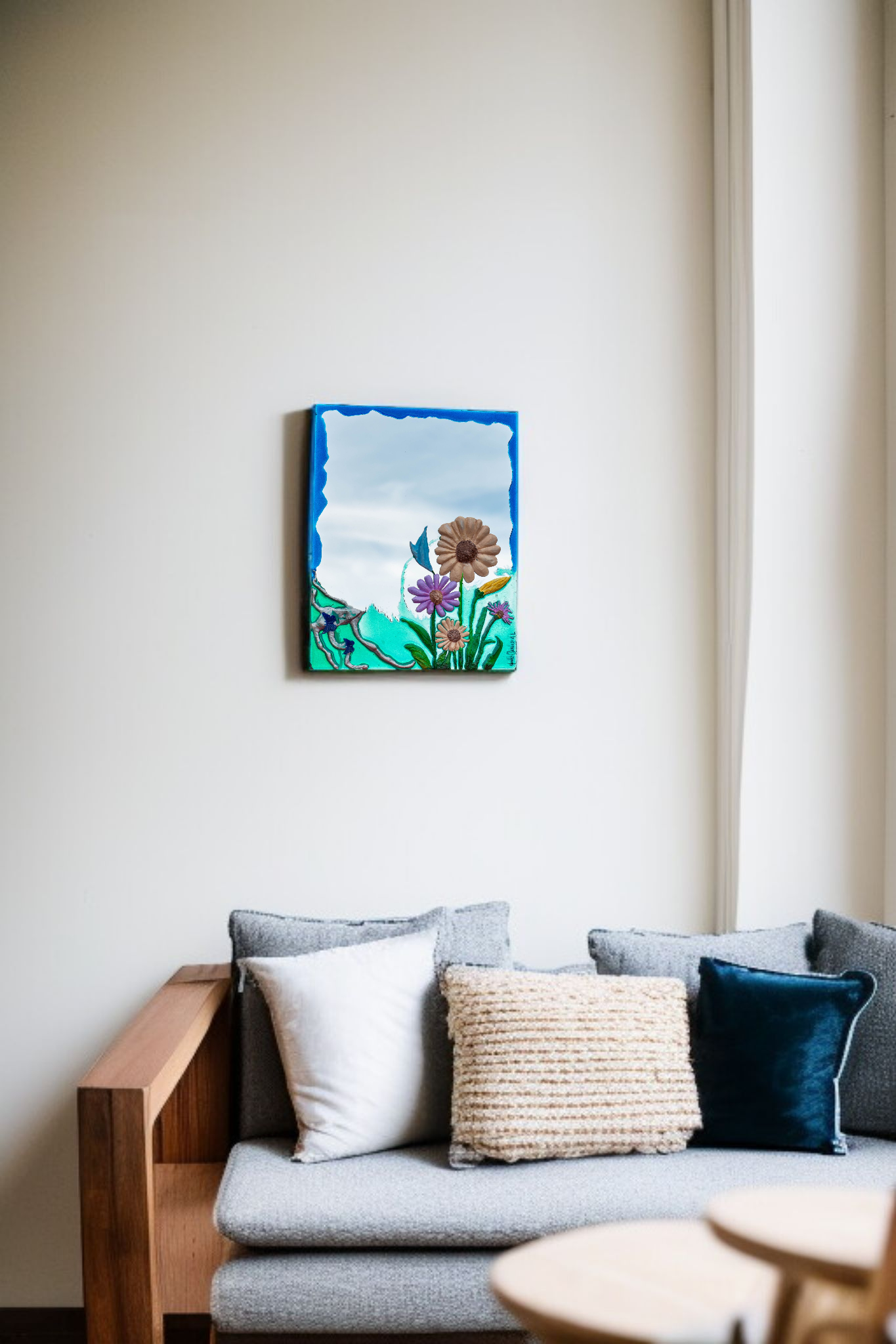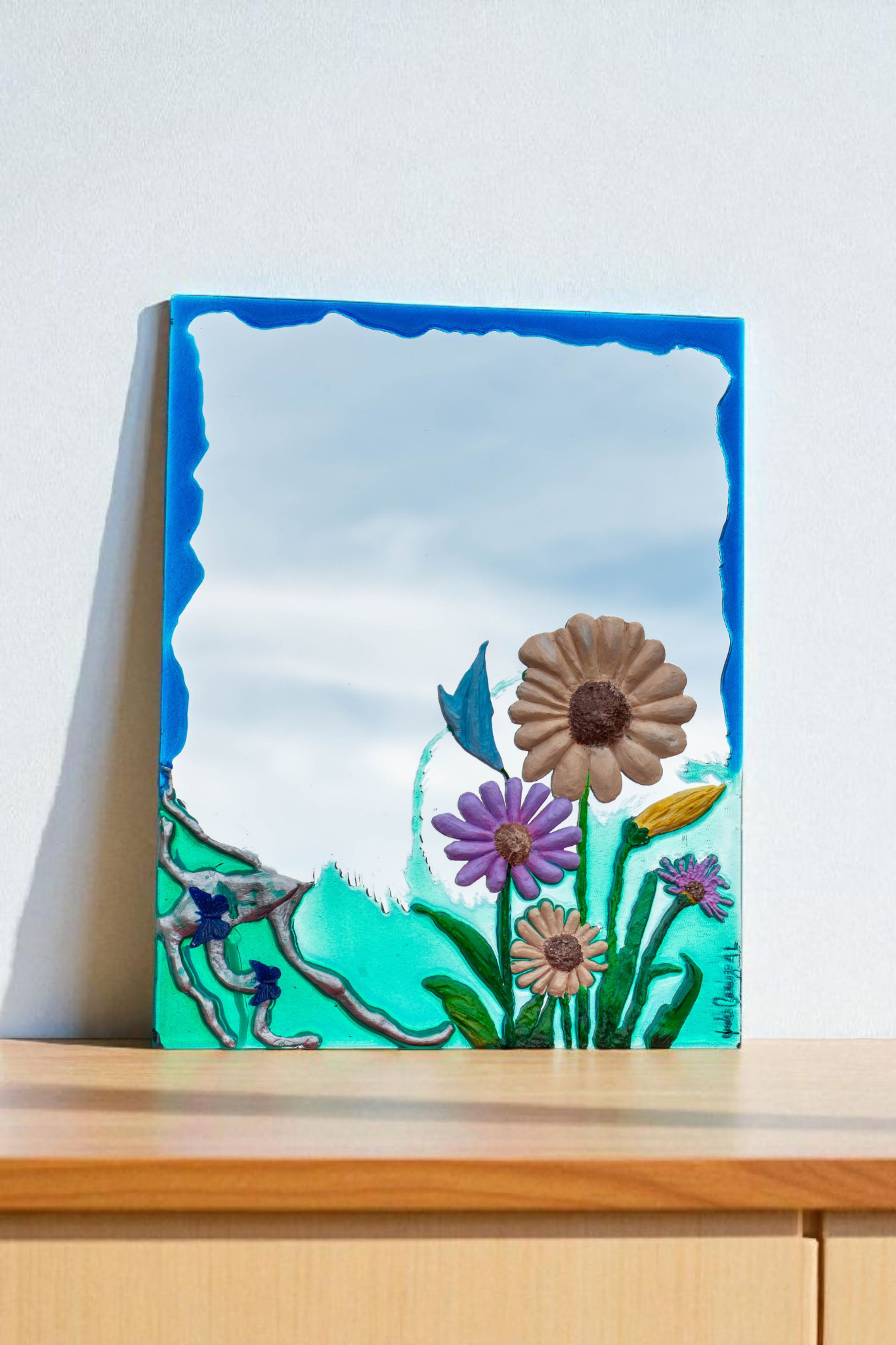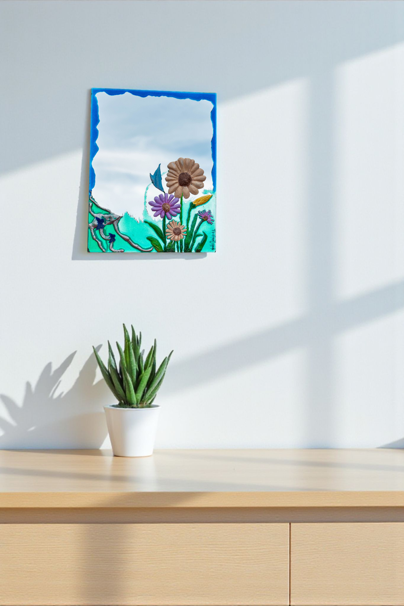 Obra artesanal de 31,5 x 40 cm, intervenida con arte en relieve en yeso y resina. Sus flores coloridas, modeladas y pintadas a mano, sobresalen con textura y volumen, creando un efecto natural y encantador que convierte al espejo en una pieza única de arte decorativo.Ideal para aportar frescura y un toque artesanal a cualquier ambiente, fusionando funcionalidad con expresión artística.