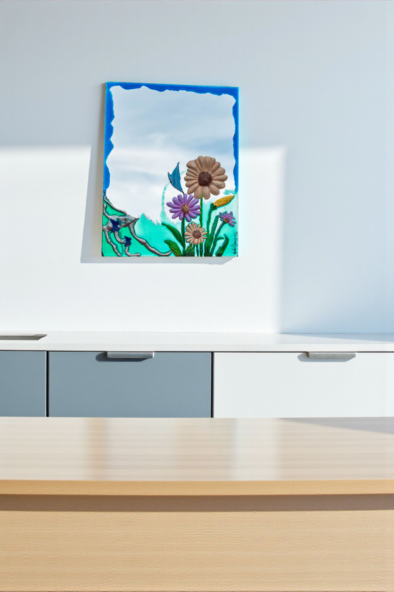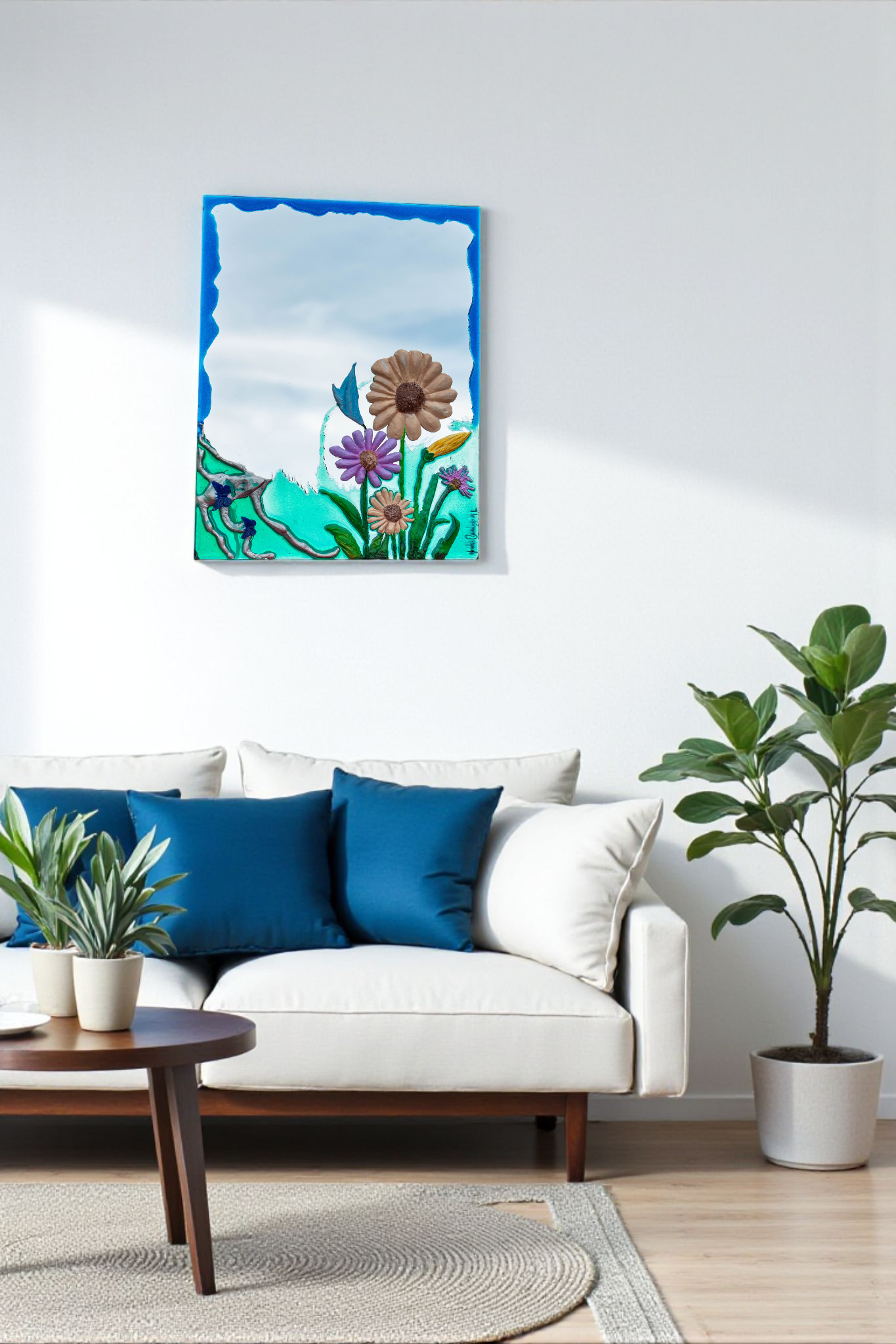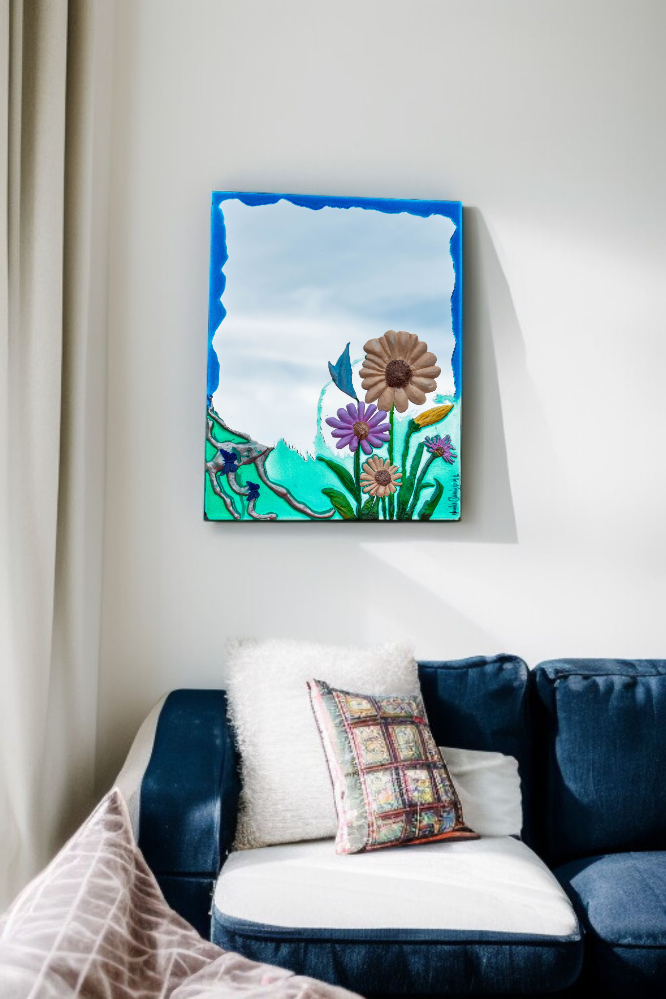 Obra artesanal de 31,5 x 40 cm, intervenida con arte en relieve en yeso y resina. Sus flores coloridas, modeladas y pintadas a mano, sobresalen con textura y volumen, creando un efecto natural y encantador que convierte al espejo en una pieza única de arte decorativo.Ideal para aportar frescura y un toque artesanal a cualquier ambiente, fusionando funcionalidad con expresión artística.