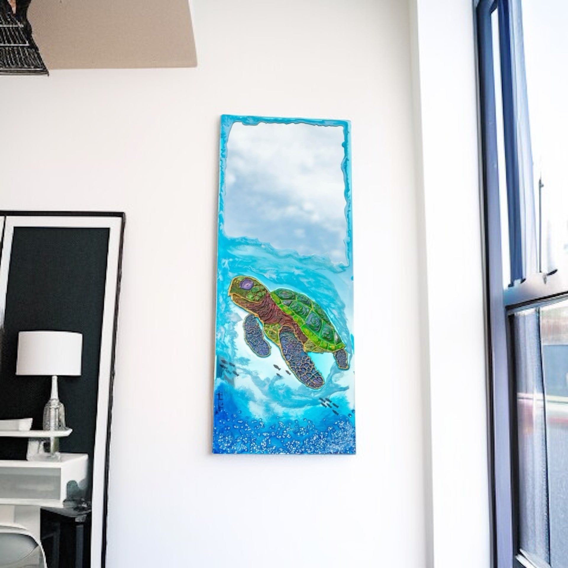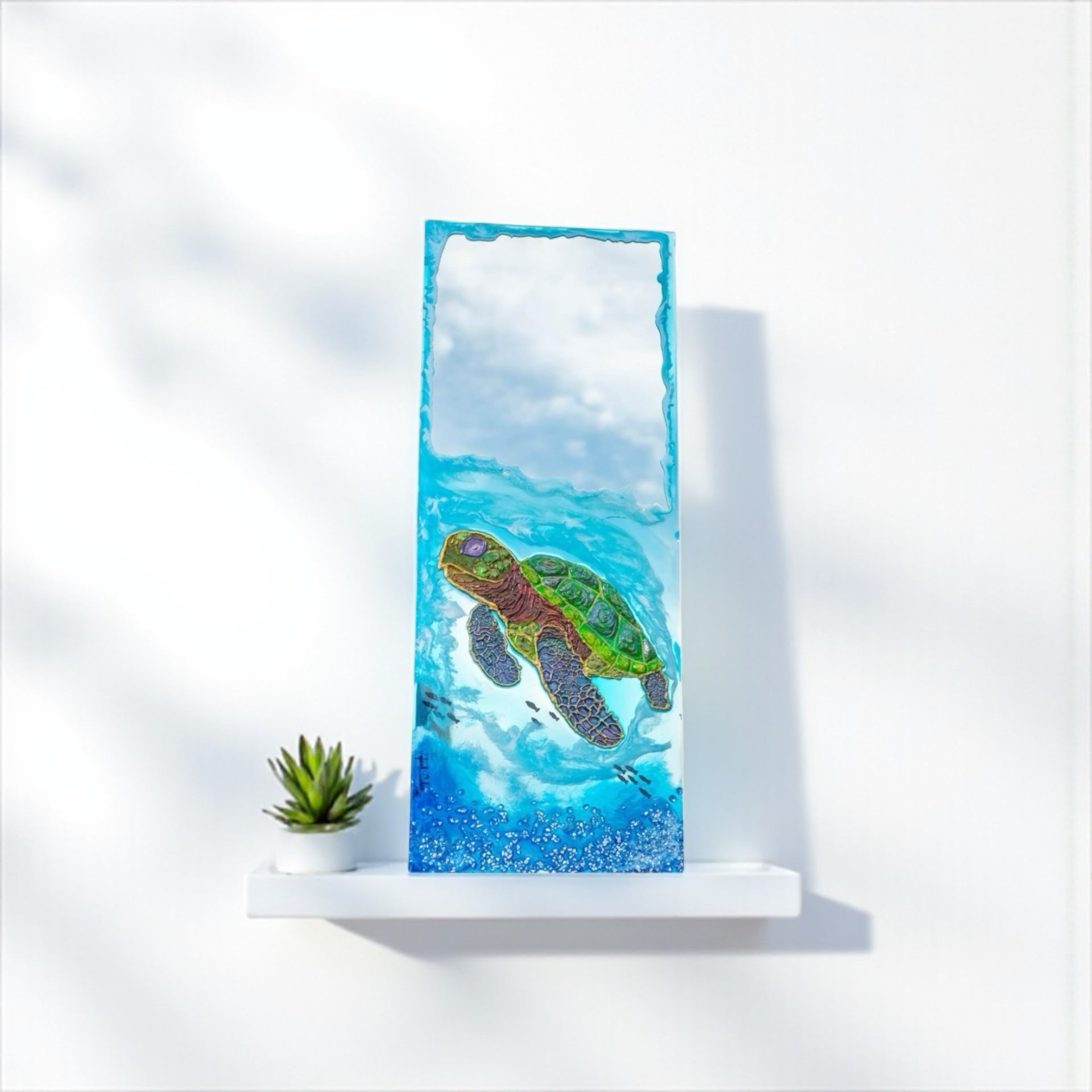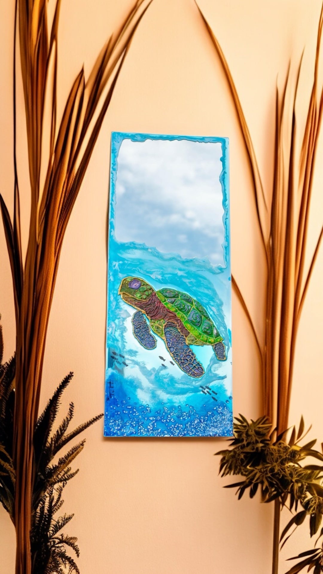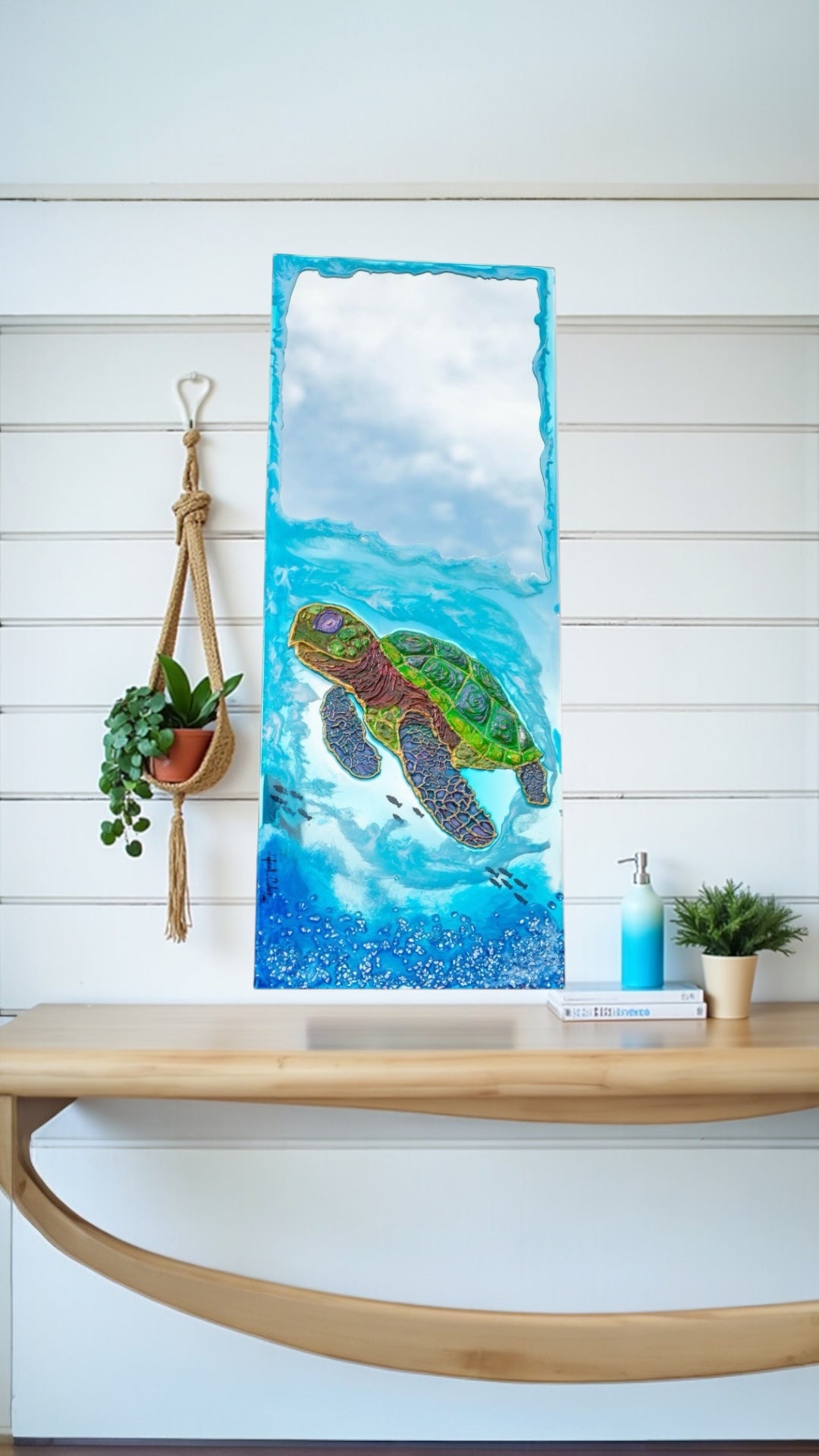 Espejo trabajado en pasta relieve, acrílico, tintas varias, mica. Resina.