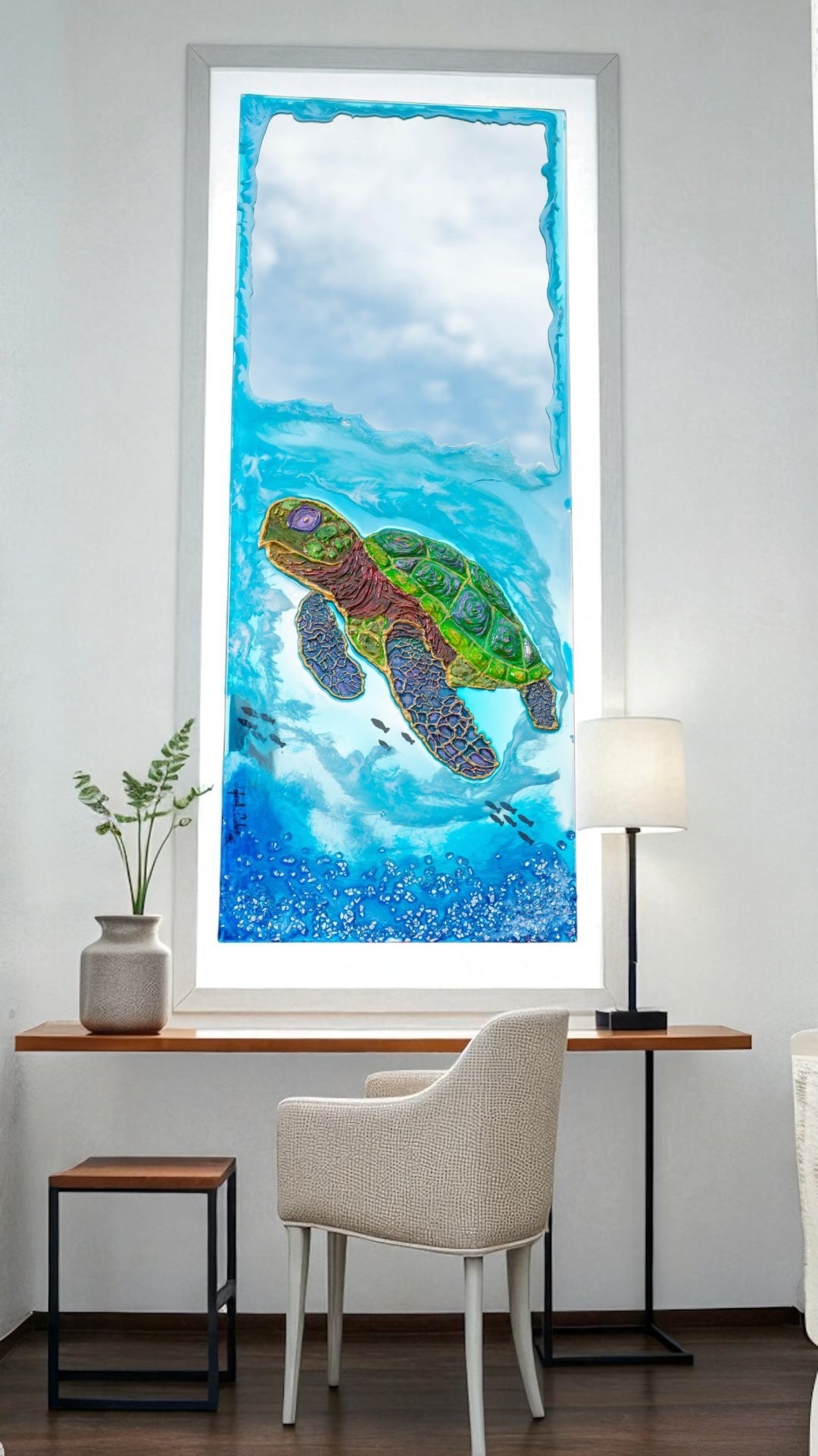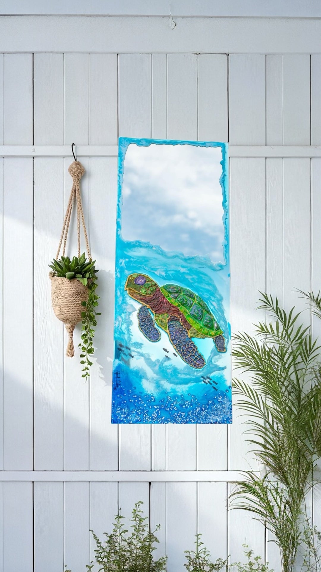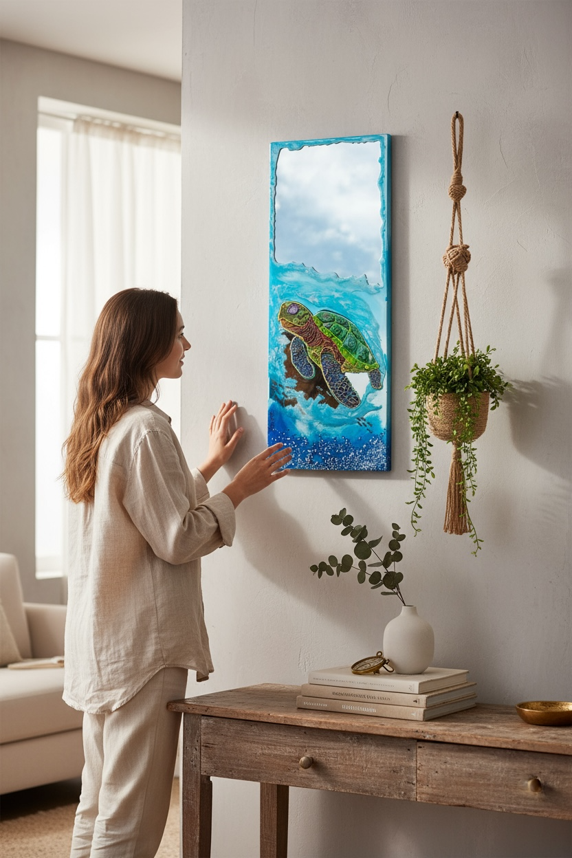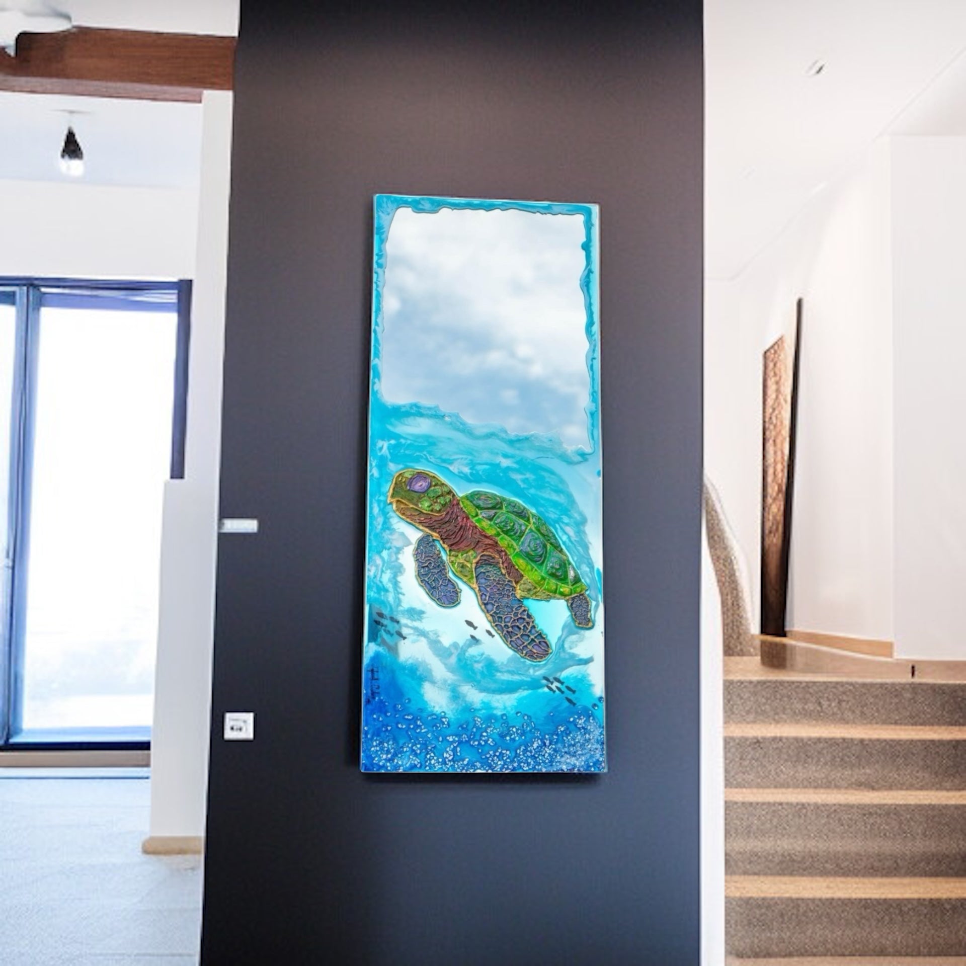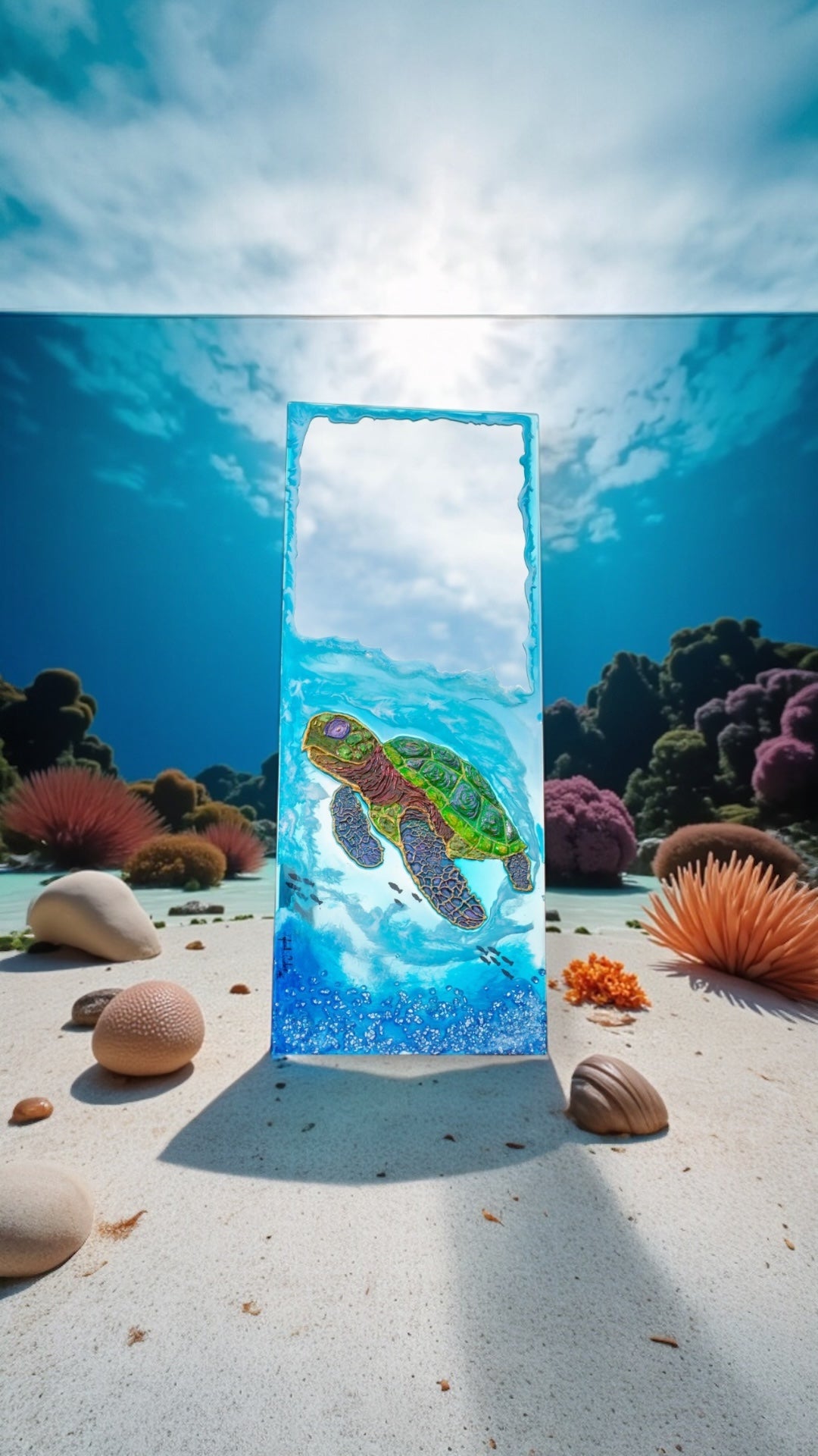 Desde las profundidades, emerge María Antonieta, guardiana de los reflejos.Su cuerpo, tejido en tonos de océano y cielo,flota entre dos mundos: el visible y el secreto.