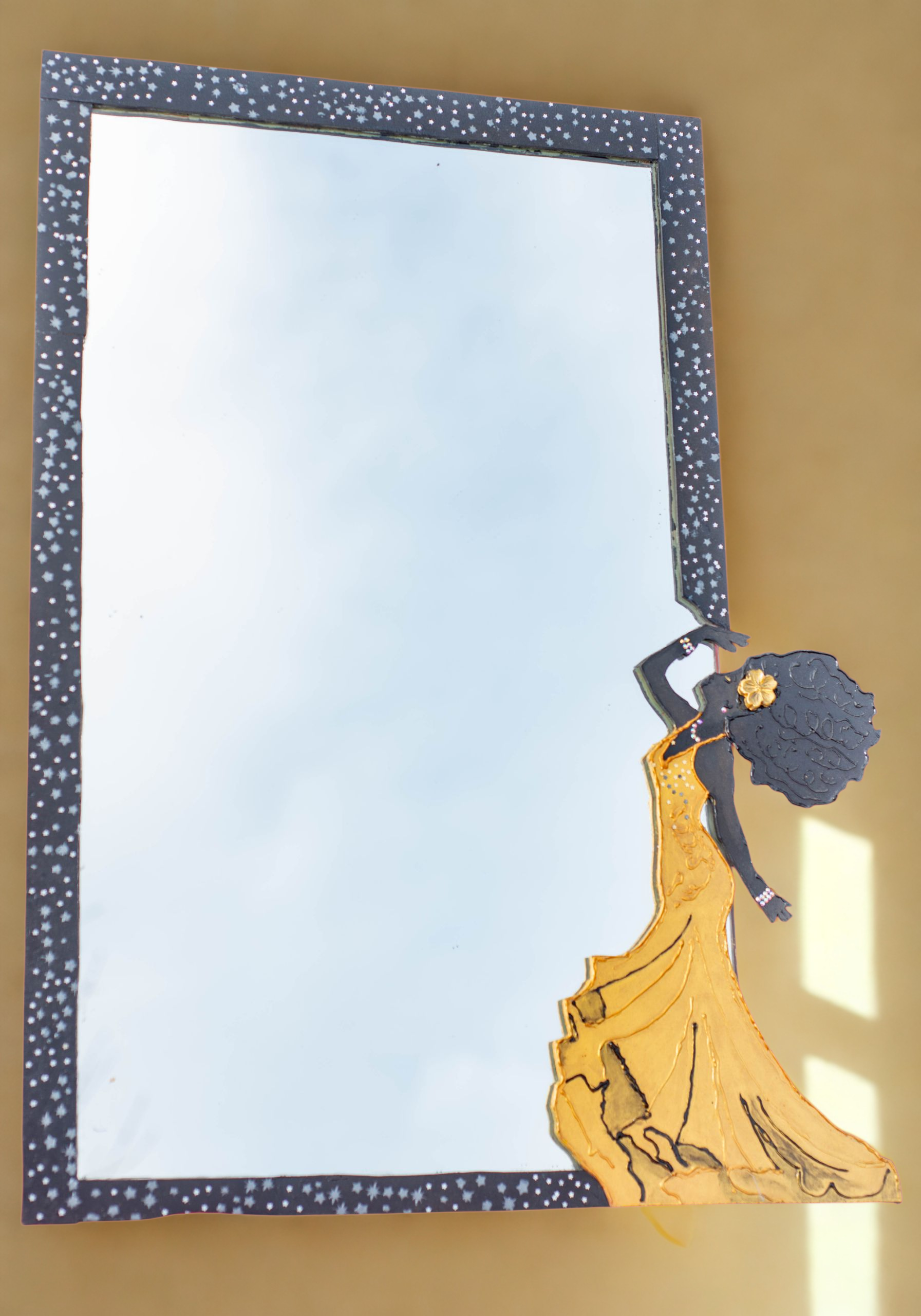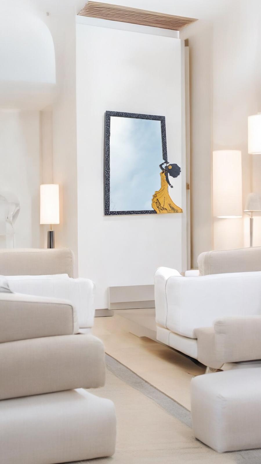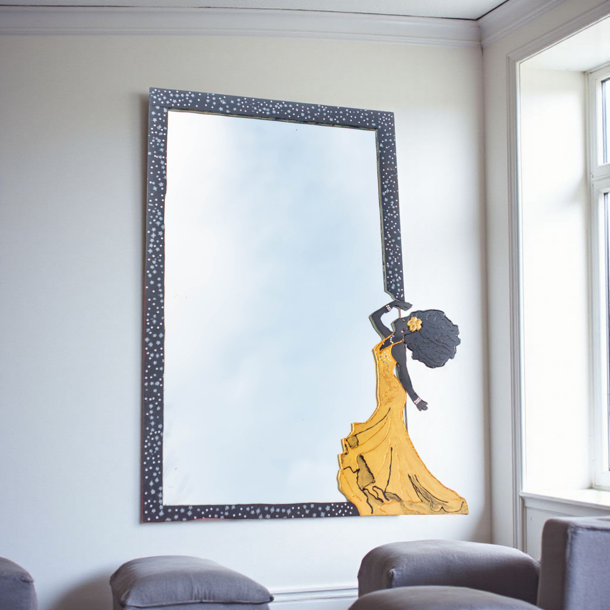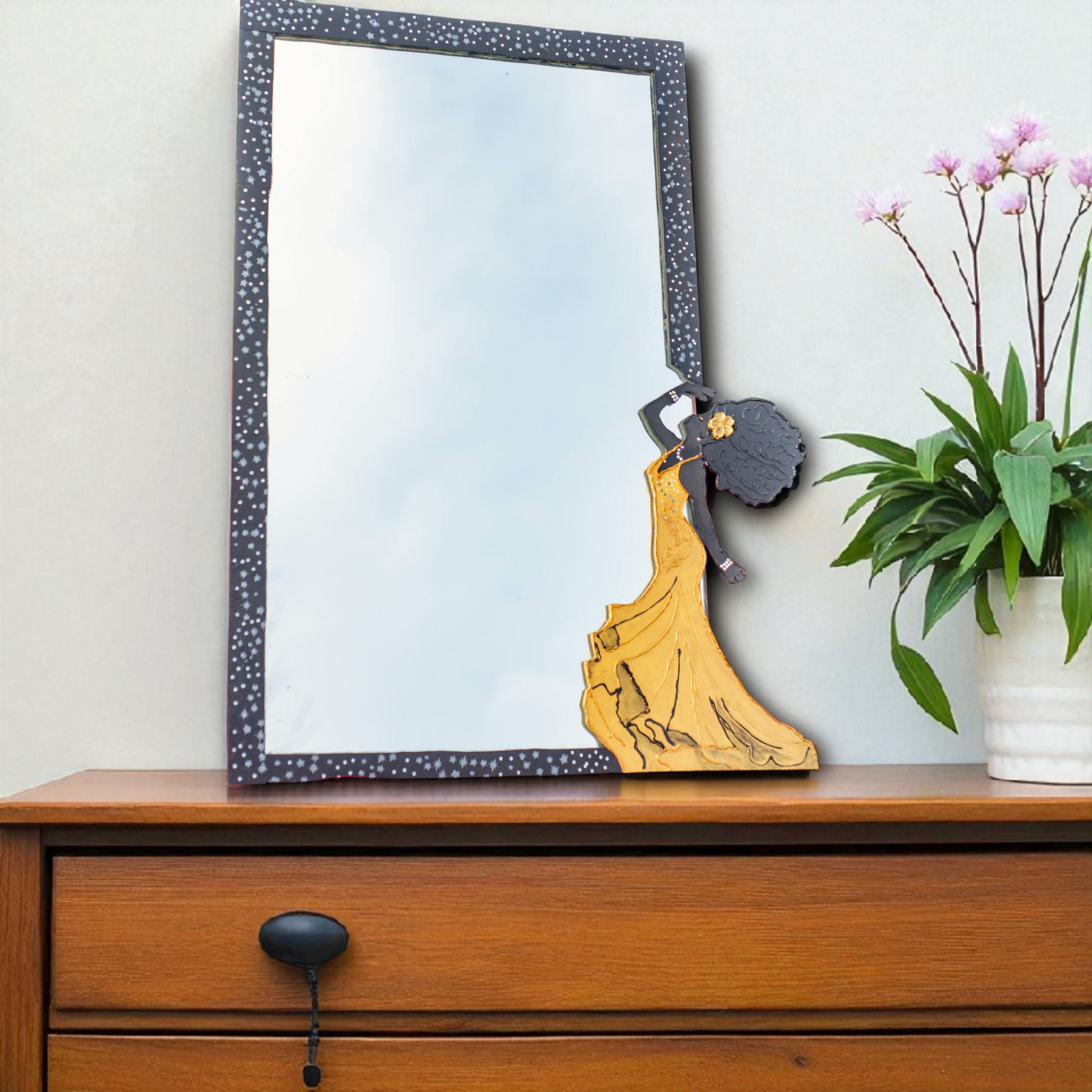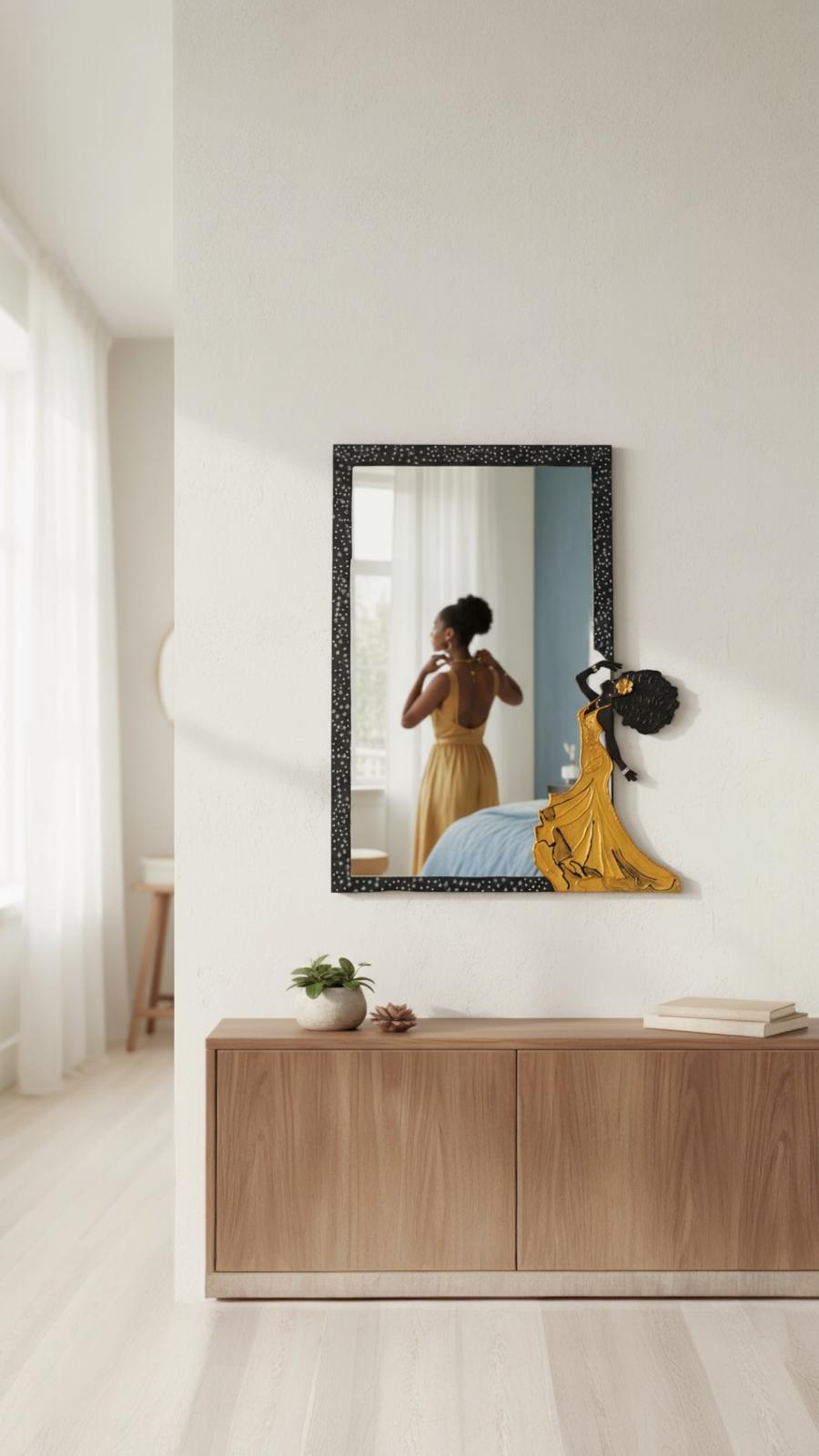 Obra artesanal de 51 x 47 cm, realizada sobre espejo con marco pintado a mano y figura femenina en arte en relieve con resina. La silueta de la dama, con un elegante vestido dorado, transmite movimiento y fuerza estética, convirtiéndose en la protagonista de esta pieza.