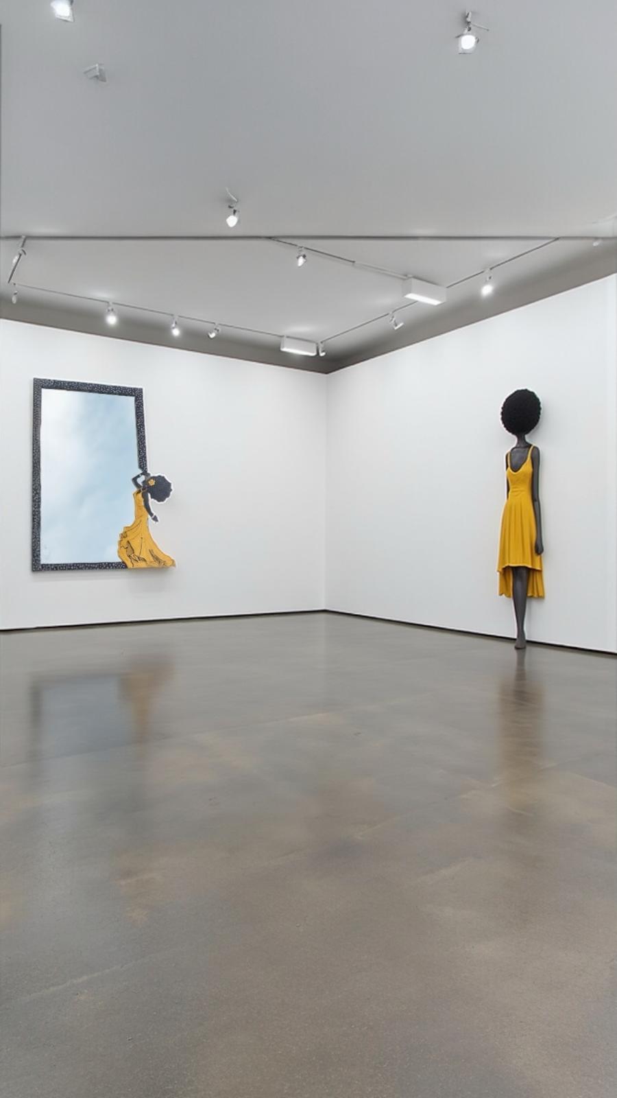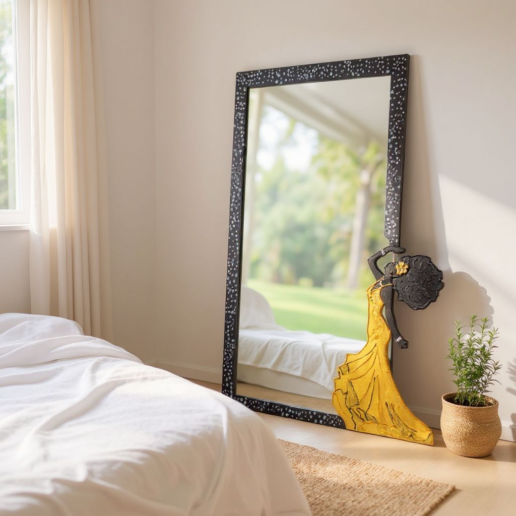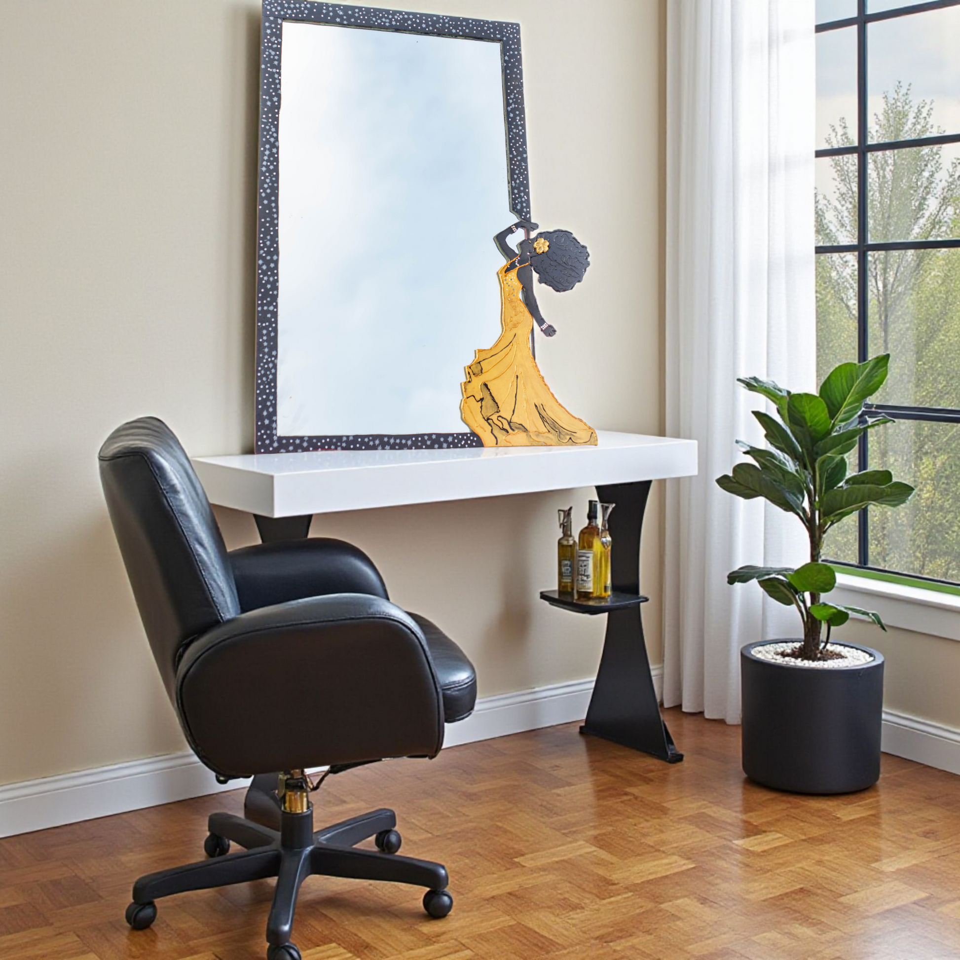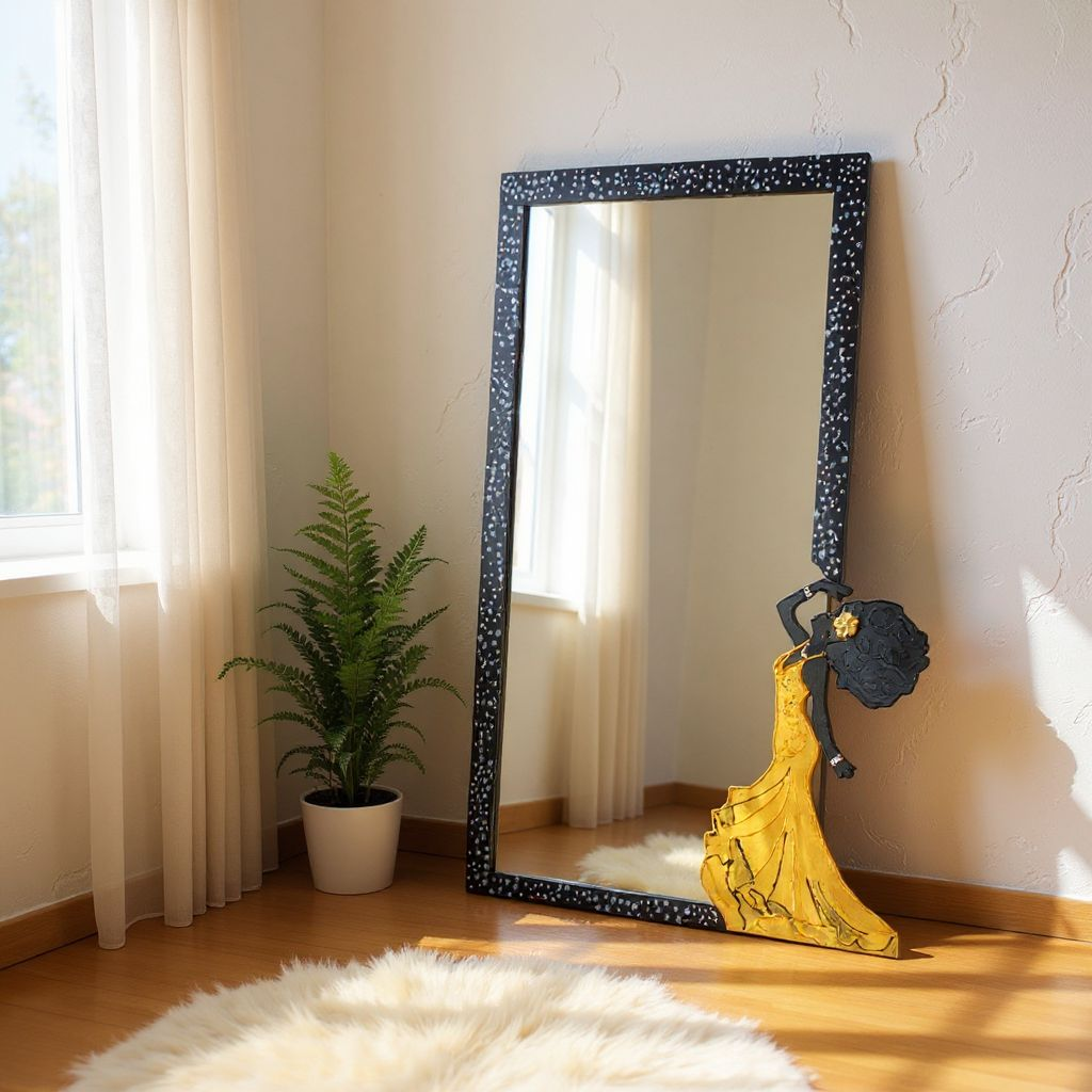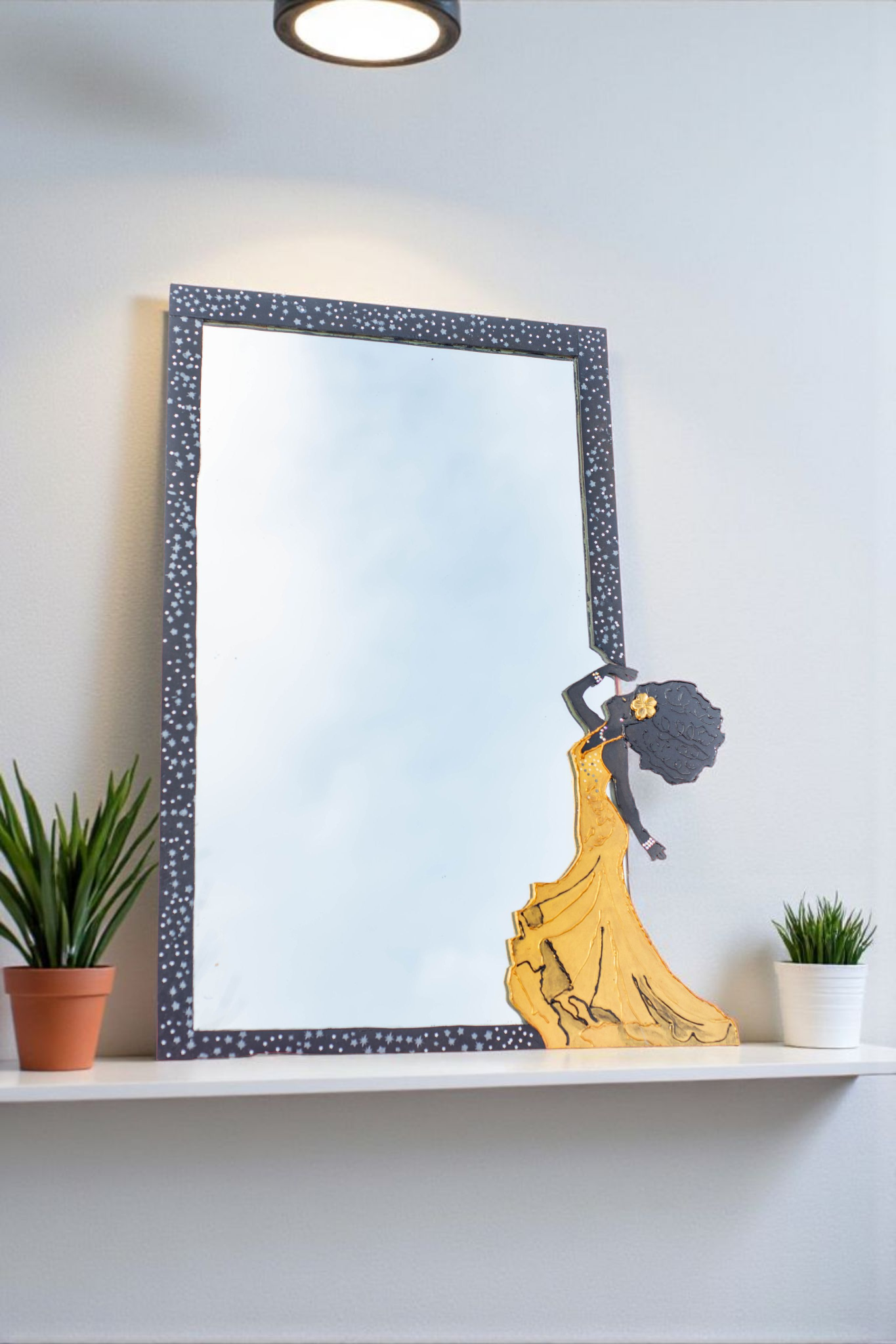 Obra artesanal de 51 x 47 cm, realizada sobre espejo con marco pintado a mano y figura femenina en arte en relieve con resina. La silueta de la dama, con un elegante vestido dorado, transmite movimiento y fuerza estética, convirtiéndose en la protagonista de esta pieza.