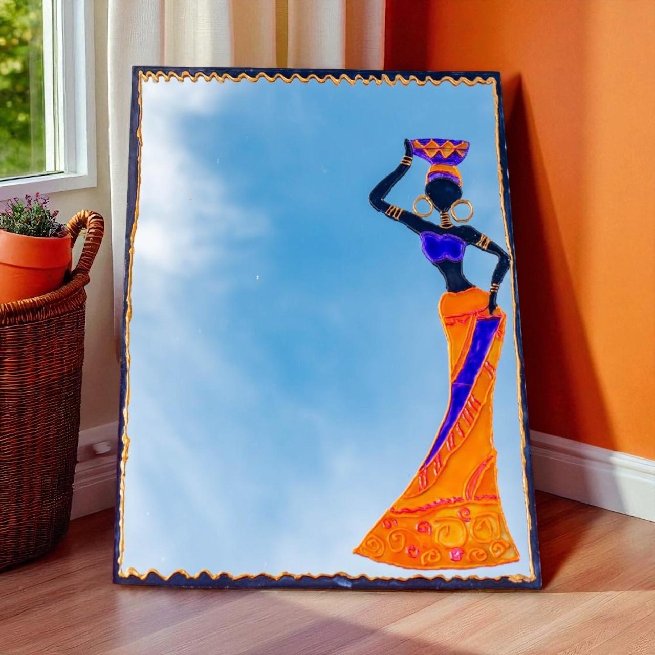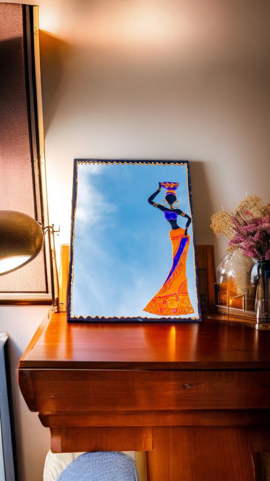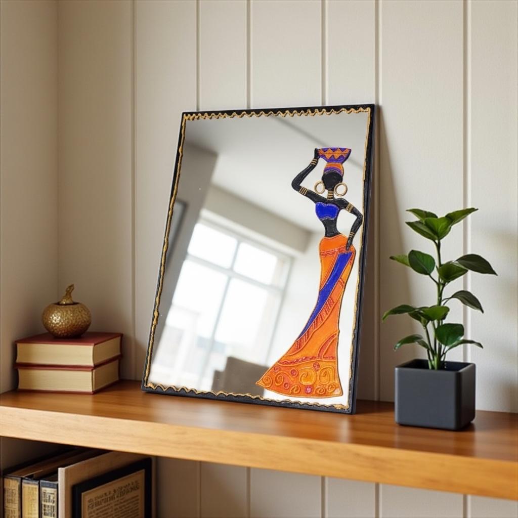Obra artesanal sobre espejo, realizada en arte relieve con resinas, acrílicos y detalles dorados. Representa la fuerza y elegancia de una mujer que camina bajo el sol, llevando consigo la belleza de su cultura y el equilibrio de la vida.