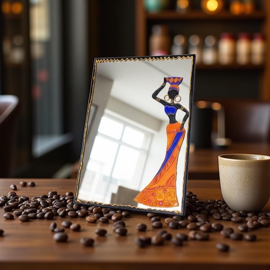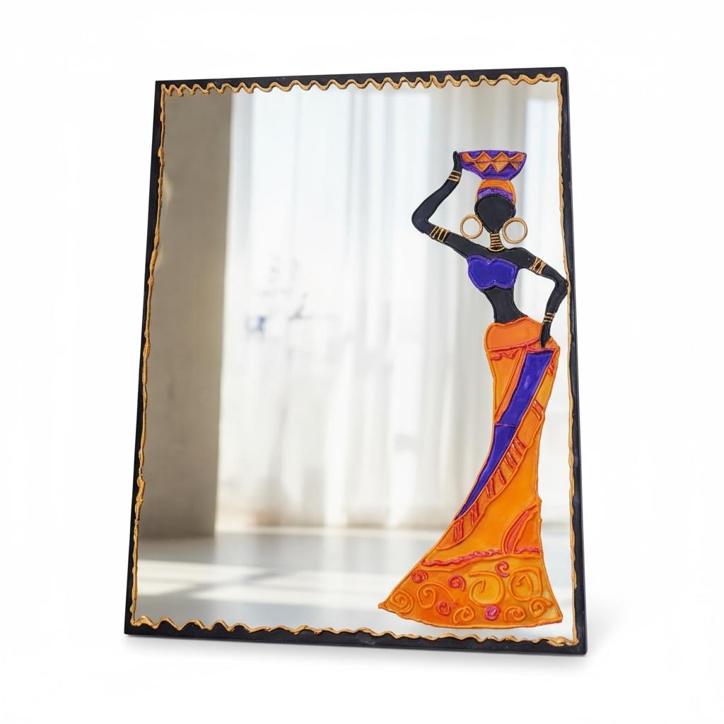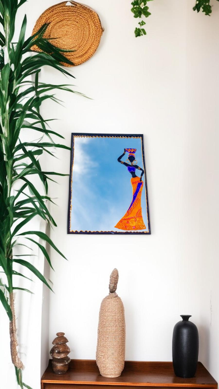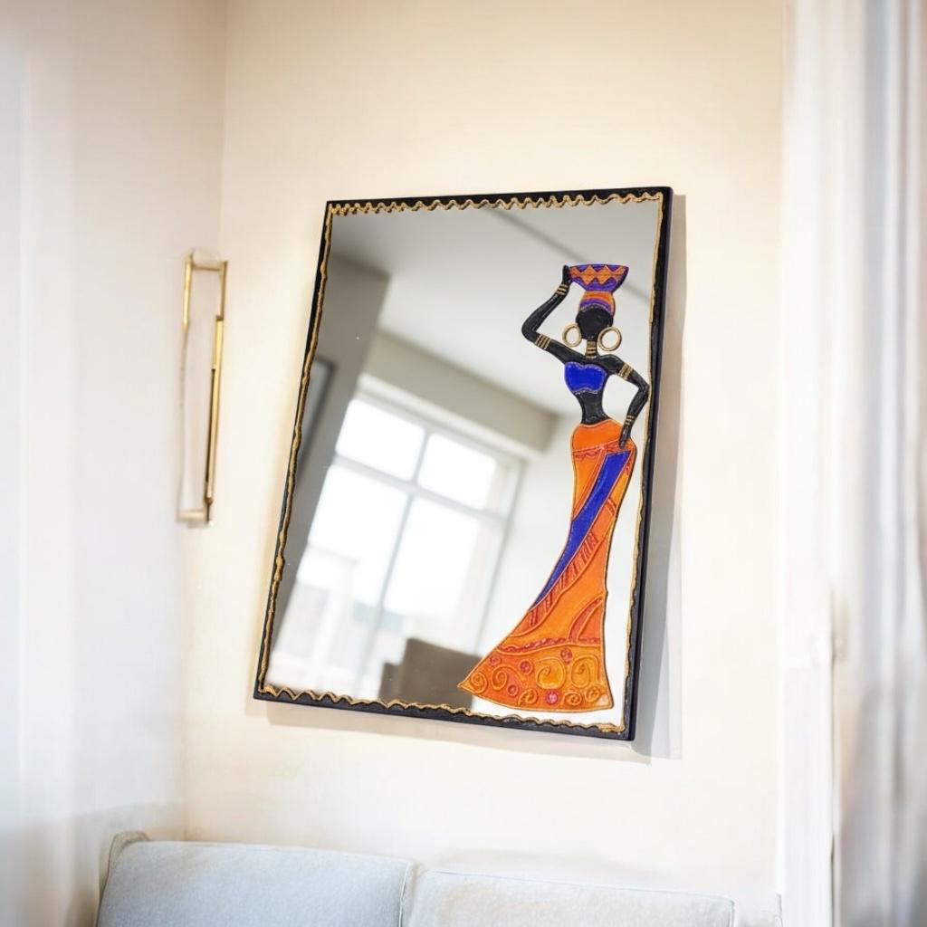 Obra artesanal sobre espejo, realizada en arte relieve con resinas, acrílicos y detalles dorados. Representa la fuerza y elegancia de una mujer que camina bajo el sol, llevando consigo la belleza de su cultura y el equilibrio de la vida.