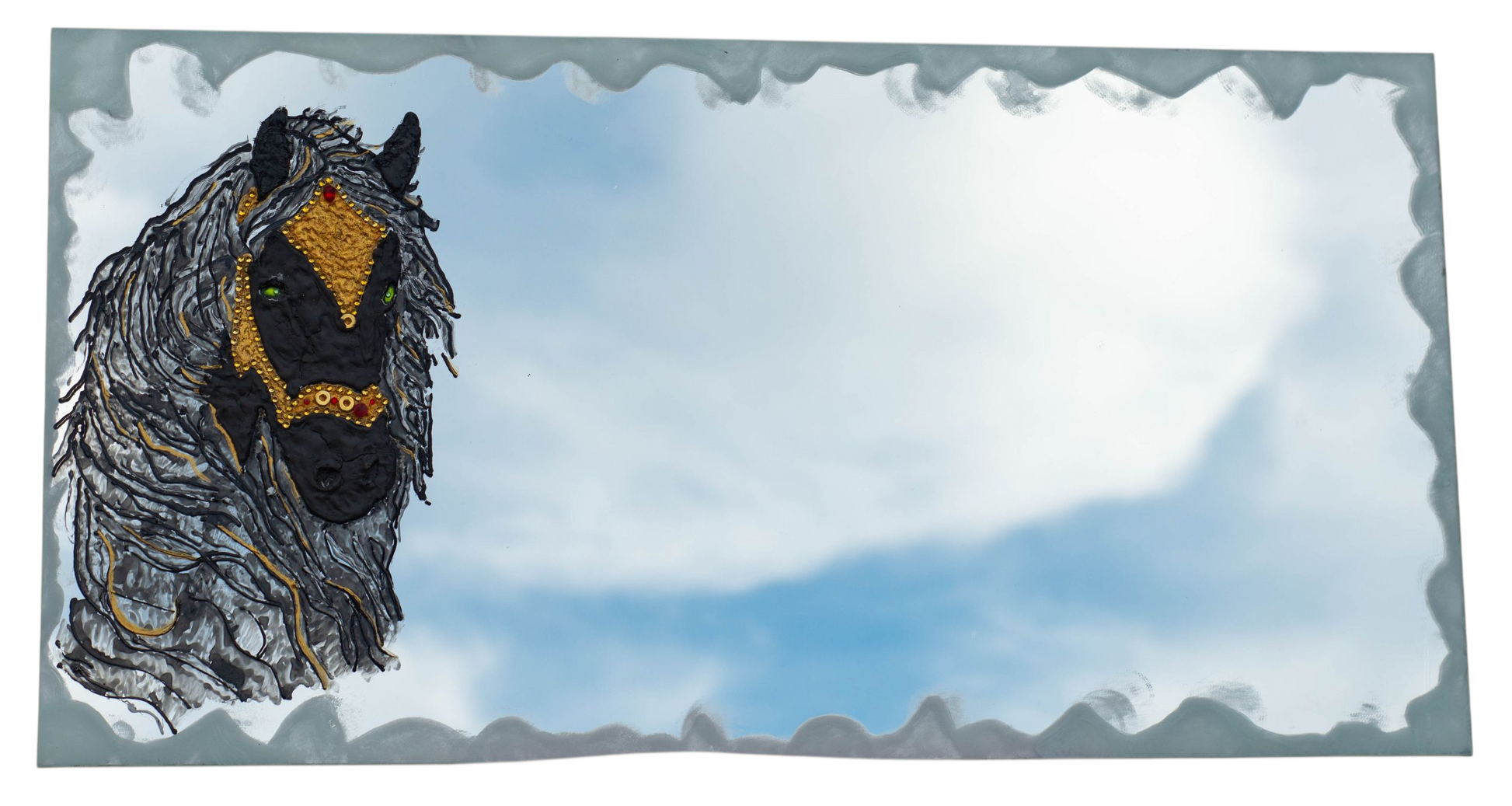 Obra artesanal de gran formato (83 x 42 cm) intervenida sobre espejo con arte en relieve, resina y pintura a mano. La pieza retrata la fuerza y elegancia de un caballo majestuoso, con melena ondulante y detalles en dorado y rojo que realzan su carácter poderoso.