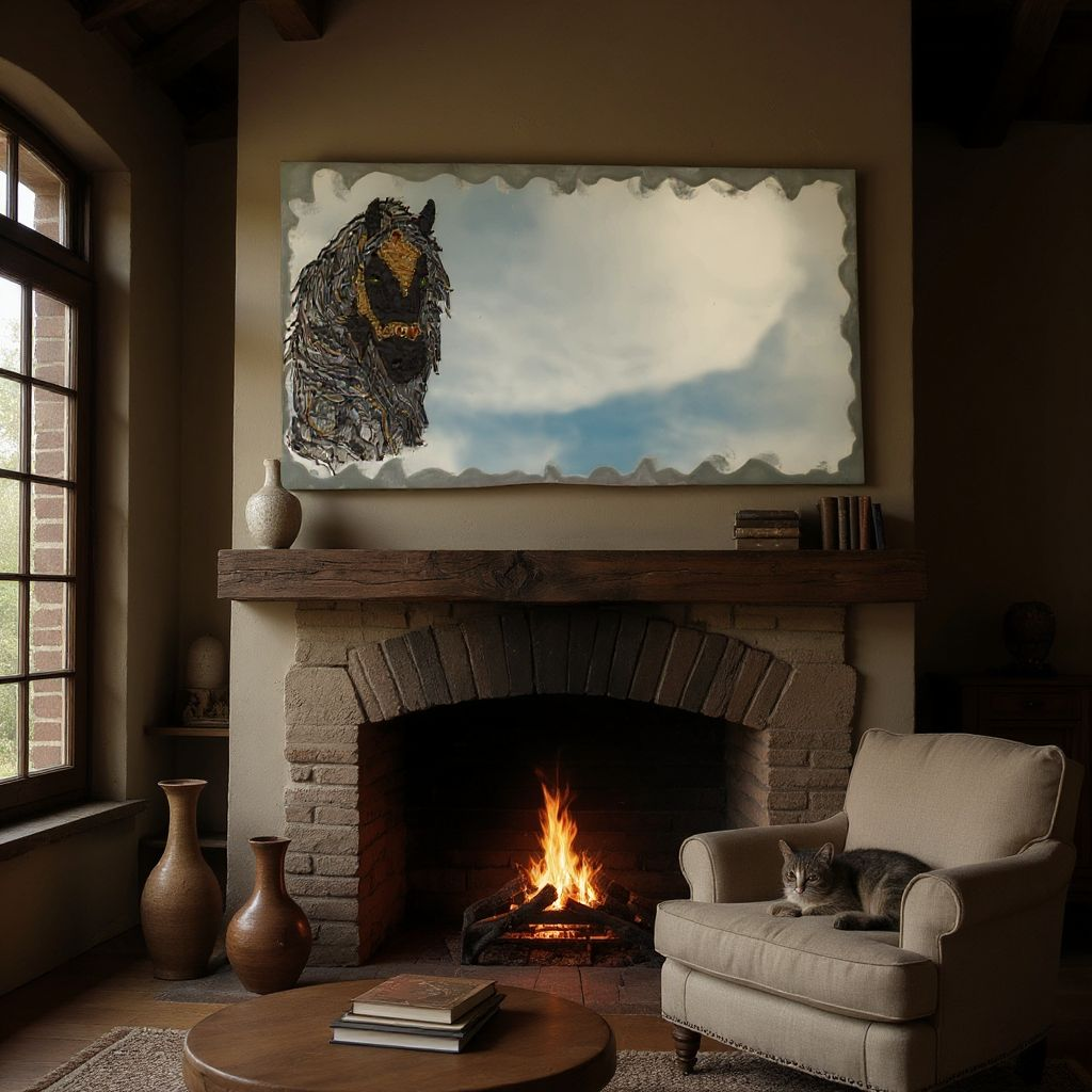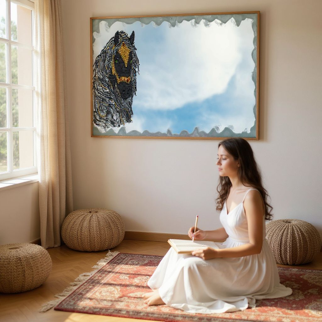 “Espíritu Indomable” es un espejo artesanal de 83 x 42 cm, creado en relieve con resina y pintura a mano. Cada detalle —desde la fuerza del caballo hasta los acabados dorados— fue trabajado minuciosamente, convirtiéndolo en una pieza única e irrepetible.