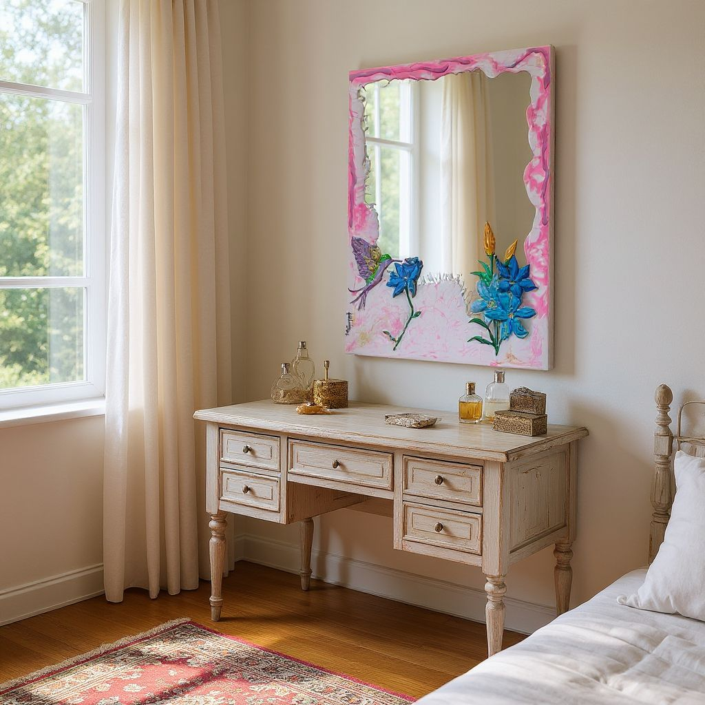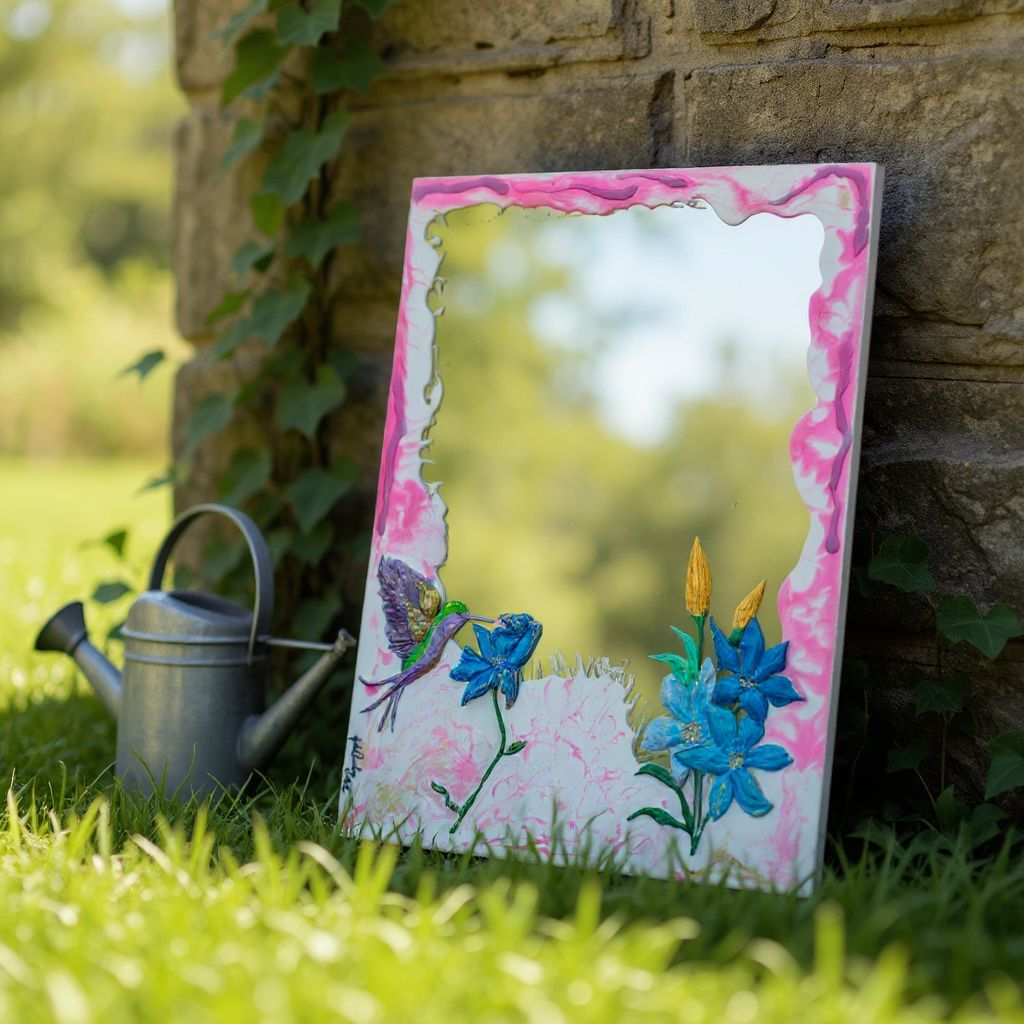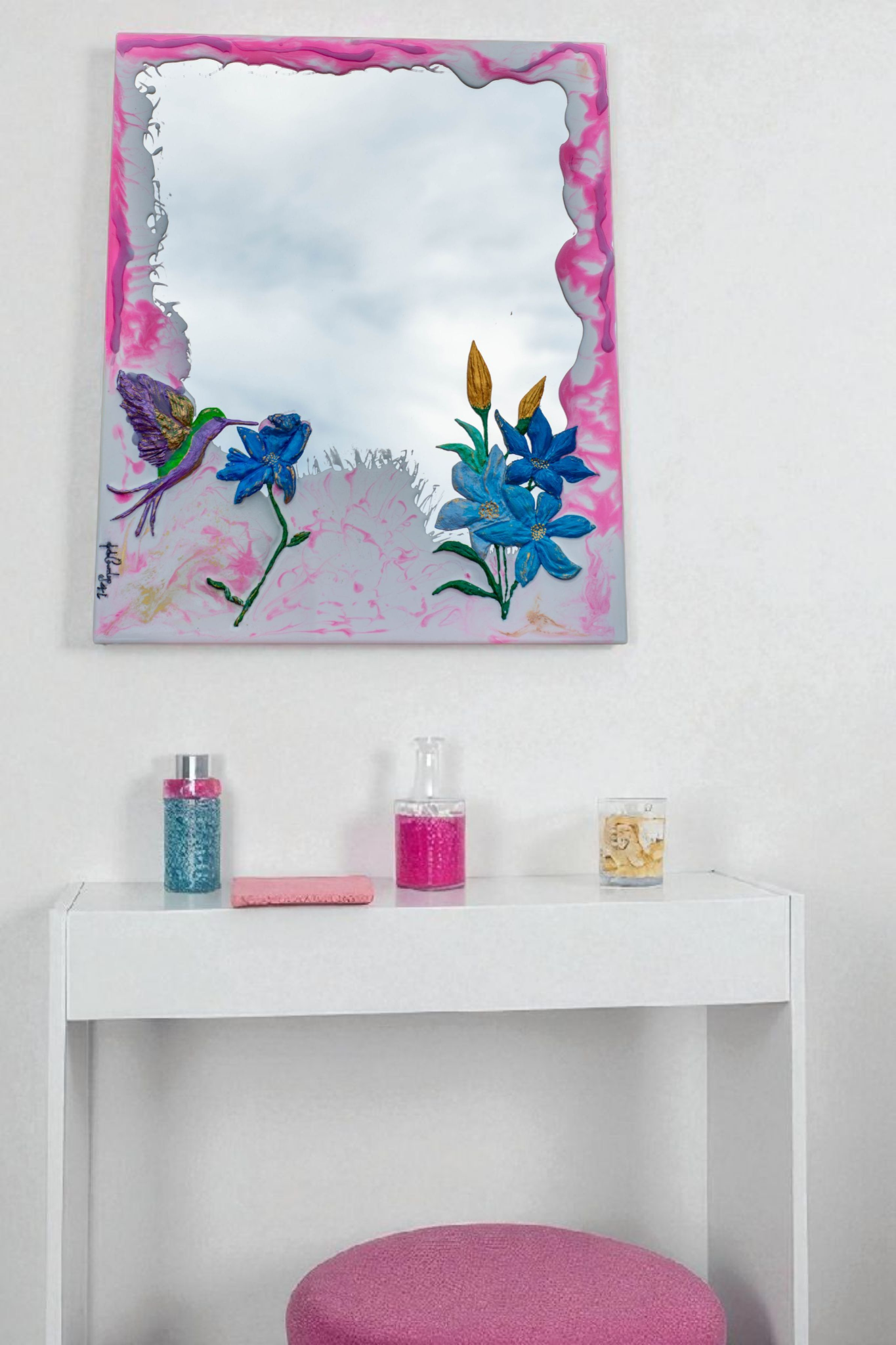 Espejo artístico único en alto relieve, trabajado a mano con pasta relieve, resinas, pintura acrílica y delicados toques de pan de oro. Un colibrí y flores azules emergen desde la superficie creando un efecto tridimensional que aporta color, movimiento y elegancia a cualquier espacio.